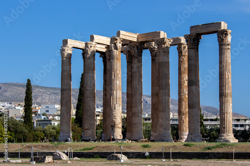 The Temple of Olympian Zeus also known as the Olympieion is a former colossal temple at the center of the Greek capital Athens. Sunny summer day with blue sky