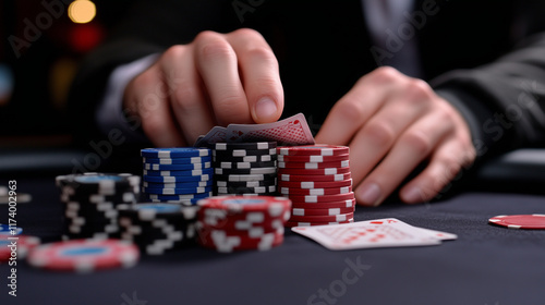 The tension of a poker game captured in playersâ hands, chips stacked in front of them, and cards face-down on the table.