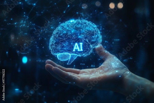 The text "AI" a hand holding a glowing brain with an AI icon and technology , in a blue color theme, representing a business idea and innovation in the artificial intelligence industry.