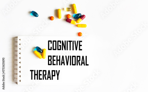 The text "COGNITIVE BEHAVIORAL THERAPY" is written in a notebook next to pills. Medical concept