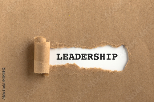 The text LEADERSHIP behind torn brown paper
