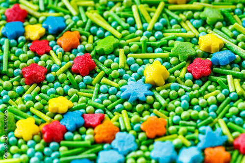 The texture of candy sprinkles.Varied sugar sprinkles, stars, flowers, dots.Holiday treat.Toppings for donuts,cupcake, desserts and ice cream .