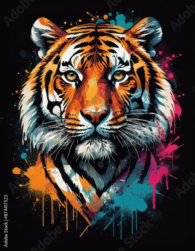 The tiger's stripes, rendered in striking detail, blend seamlessly with the abstract paint splatters, blurring the lines between realism and abstraction