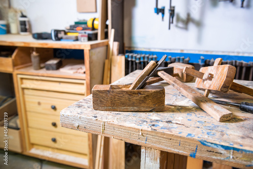 The tools of a carpenter on a work table in a carpentry workshop. Hammer, wood brush, rasp