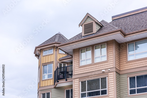 The top of an apartment building with nice windows.