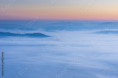 The top of the ridge in the clouds. Deep perspective. Sunset in the mountains.