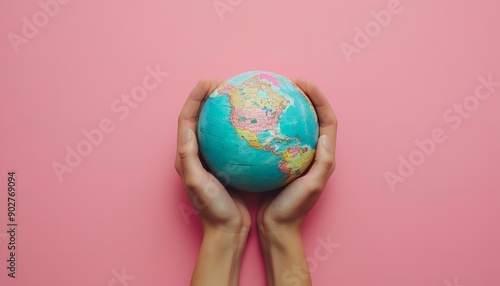 The top shot of a woman's hands holding a globe on a background of solid pink with lots of space for free writing in the backdrop, Generative AI.