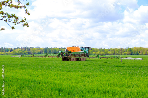 The tractor sprays wheat with pesticides. Green wheat on a beautiful blue sky background.