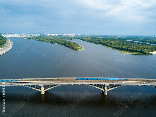 The trains of the Kiev metro are going on the bridge over the Dnieper river. Clear sunny summer day. Aerial drone view.