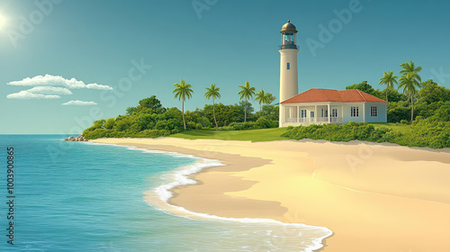 The tranquil beach showcases a charming lighthouse surrounded by lush greenery and soft sand under a clear blue sky