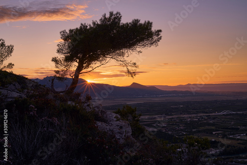the tree that contemplates the sunset with the sun's rays hiding among the mountains