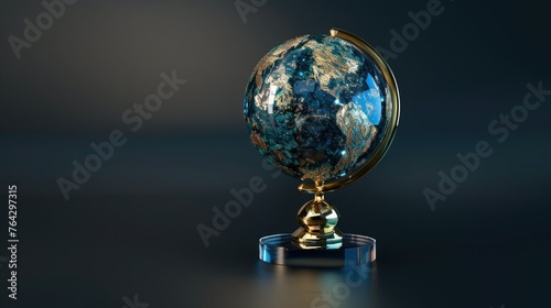 The trophy is made of glass and metal, and the clear blue base gives it a luxurious feel. The top features an elegant globe design to symbolize global unity.