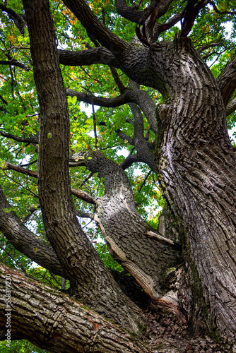The trunk and branches of a powerful oak rushing up, vertical view