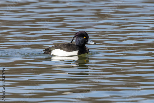 The tufted duck, Aythya fuligula, a diving duck swimming on a Lake at Munich