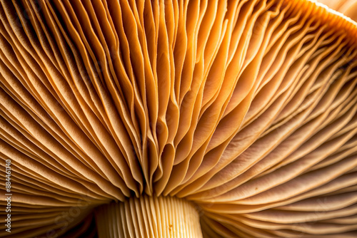 The underside of a mushroom with a brown stem. The mushroom has a very intricate and detailed texture, with many small ridges and bumps. Scene is one of curiosity and wonder