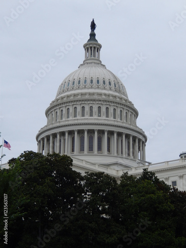 The United States Capitol Building, the eastern facade with the dome from the park, on a cloudy day in Washington DC.