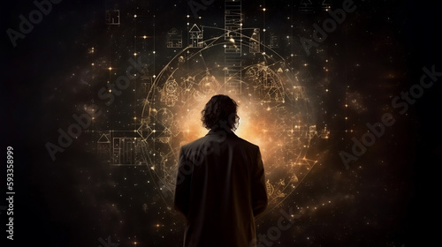 The universe within. Silhouette of a man inside the universe, physical and mathematical formulas.. The concept on scientific and philosophical topics, Generative Ai
