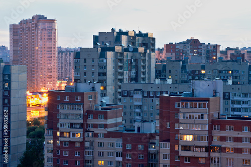 The variety of architecture of the residential area from a bird's eye view during the white nights of St. Petersburg.