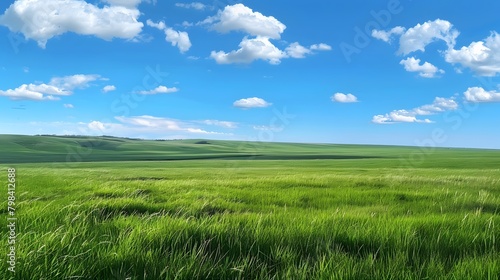 The vast grassland under the blue sky and white clouds, with endless green meadows stretching to the horizon.
