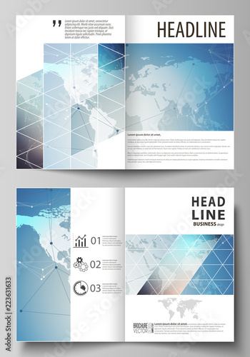The vector illustration of the editable layout of two A4 format modern cover mockups design templates for brochure, flyer, booklet. Polygonal geometric linear texture. Global network, dig data concept