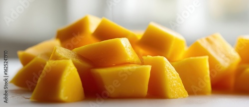 The vibrant mango cubes arranged beautifully on a white background.
