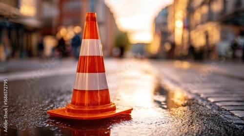 The vibrant traffic cone standing on a wet urban street at sunset.