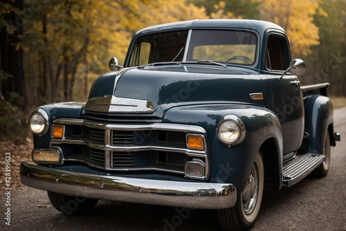 the vintage pickup truck head-on, emphasizing the grille, round headlights, and front bumper