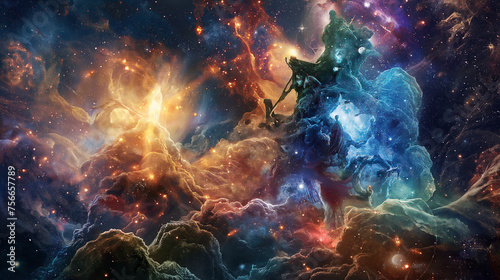 The vision of Revelation, with fantastical creatures and symbols surrounding a figure representing John, set against a cosmic backdrop, with copy space