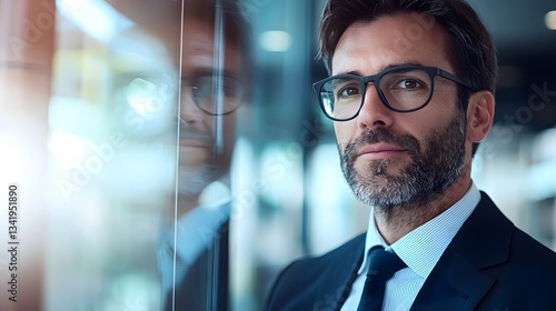 The Visionary: Confident and successful professional man with eyeglasses, gazing into the future with a look of determination.