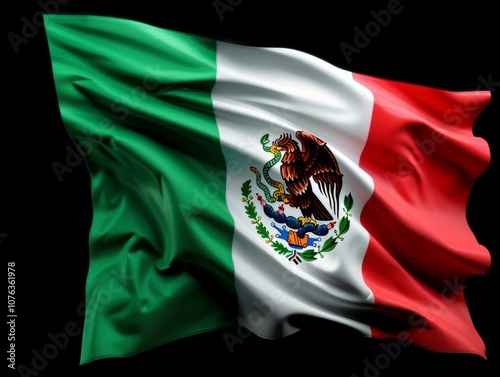 The vivid colors of the Mexican flag ripple majestically, showcasing its iconic emblem. This striking display emphasizes the spirit and culture of Mexico against a dark backdrop.