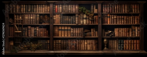 The wall full shelf of ancient books and manuscripts in library room vintage style. AI generated