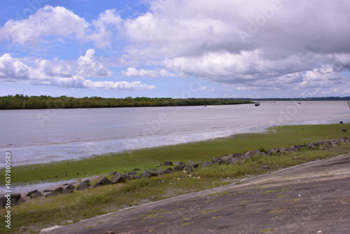 The wide Bakkhali River estuary in Cox's Bazar, viewed from the protective embankment on a dramatic, cloudy day during the monsoon season.