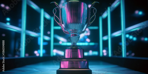 The winner's trophy is shown on a stage in a studio that is neon-lit, with a blurry background. - Generative AI