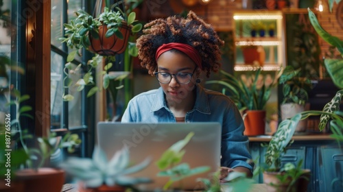 The woman with laptop and plants