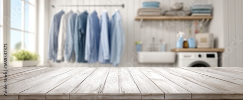 The Wooden Table in a Bright Laundry Room with Hanging Blue Shirts