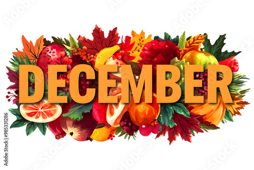 The word "December" is inscribed amidst vibrant fall foliage, fruits, and flowers on a white backdrop.