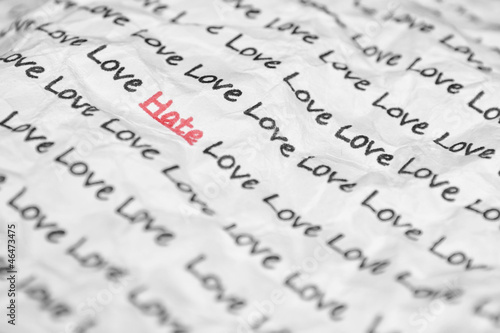 The word hate, love written on a crumpled piece of closeup.
