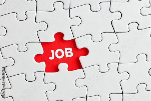 The word job written on red missing puzzle piece. To search of to find a job