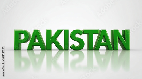 The word pakistan in green capital letters with reflection on a white surface background studio shot