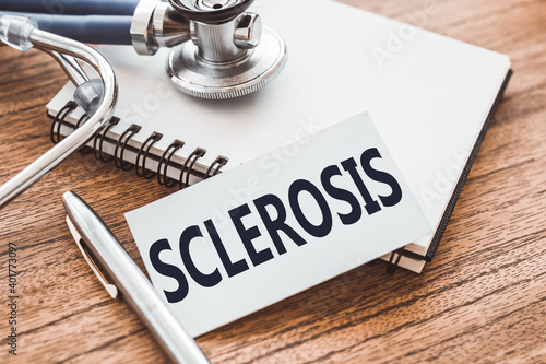 The word SCLEROSIS on a card on a wooden table with a stethoscope and a notebook for medical records.