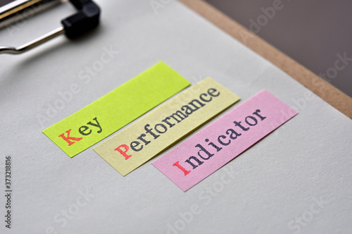 The words "KPI" written on sticky note with clipboard in diagonal angle.