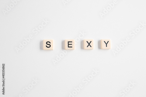 the words sexy written as a flat lay in wood scrabble tiles on a plain white background