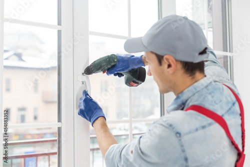 The worker installing and checking window in the house