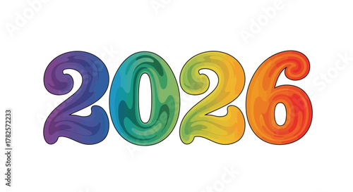 The year 2026 depicted in vibrant, rainbowcolored balloonlike font, isolated on, suggesting celebration, joy, and festive future