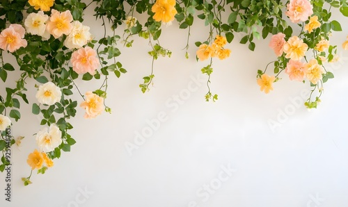 The yellow and pink small flowers hang from the white wall, Generative AI