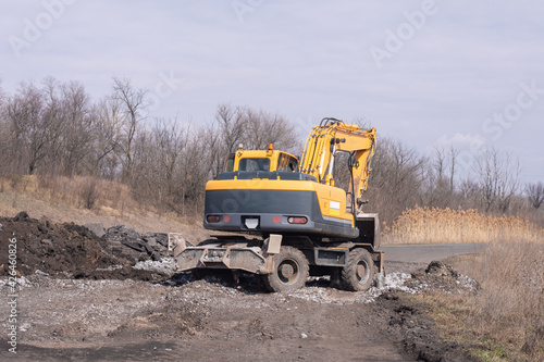 The yellow excavator works on road repairs. Road Repair out of town.