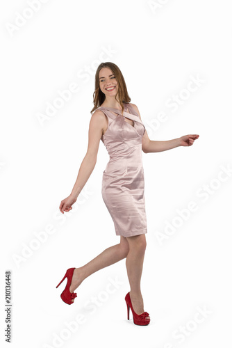 The young attractive girl in an evening rose dress goes on a party, isolated