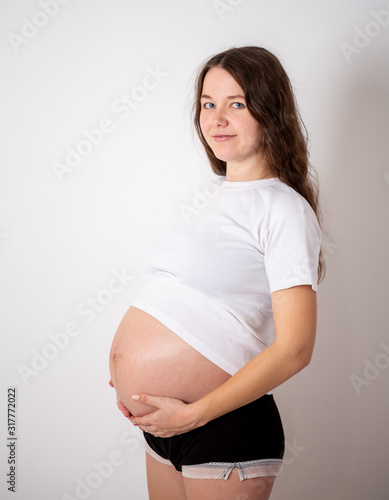 The young beautiful pregnant woman experiences strong emotions on a white background