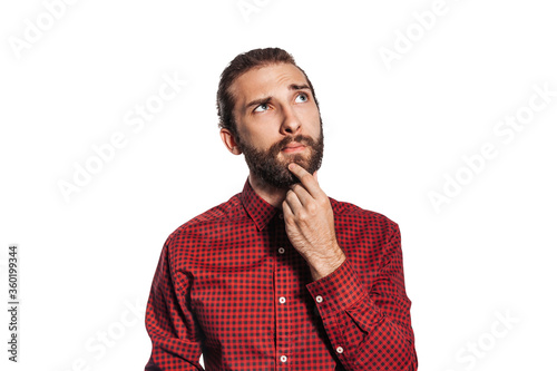 The young man is thinking. Young guy with a pensive look on a white background. Isolate Place for advertising and promotional labels.