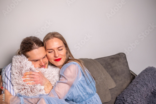 The young smiling couple in love caressing a fluffy light gray pillow,. The joy of being together.